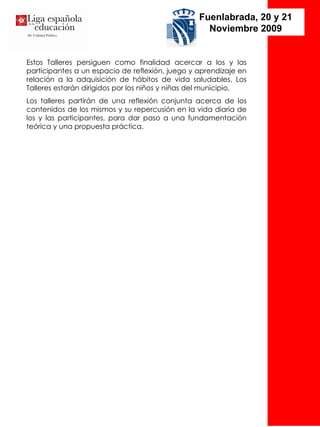 Este documento describe unas jornadas organizadas por el Ayuntamiento de Fuenlabrada para conmemorar el 20 aniversario de los Derechos del Niño. Las jornadas incluirán talleres educativos sobre hábitos de vida saludables para niños y jóvenes, así como un concurso fotográfico sobre el derecho a la salud. Se celebrarán el 19 y 20 de noviembre de 2009 en Fuenlabrada.