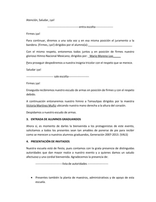 Este documento presenta el programa de la ceremonia de graduación de la Escuela Primaria "Cuauhtémoc". La ceremonia incluye una bienvenida, honores a la bandera mexicana e himno nacional, entrada de los alumnos graduandos, presentación de invitados, mensaje del director, entrega de certificados, palabras de despedida de los alumnos de quinto grado, palabras para los graduandos, y despedida final. El evento celebra el logro de los alumnos que completaron su educación primaria y marca el fin de una etapa