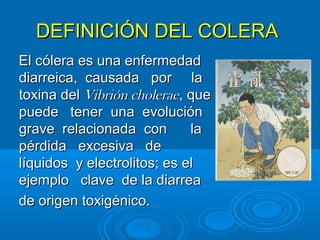 Este documento describe el programa de cólera del Ministerio de Salud de Bolivia. Define el cólera como una enfermedad diarreica causada por la toxina del Vibrio cholerae que puede causar deshidratación grave y la muerte. Detalla las actividades de prevención, vigilancia, control de brotes e indica que el programa ha logrado mantener la incidencia de cólera en 0 casos a nivel nacional.