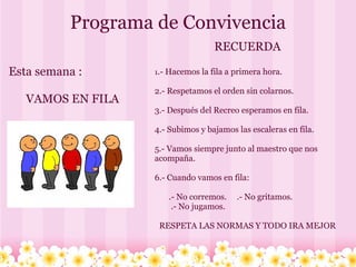 Este documento presenta las normas de convivencia de un colegio. Establece reglas sobre comportamiento en fila, postura correcta al sentarse, atención en clase, puntualidad, respeto hacia los demás, limpieza e higiene personal. El objetivo es crear un ambiente ordenado y de respeto mutuo entre los estudiantes.