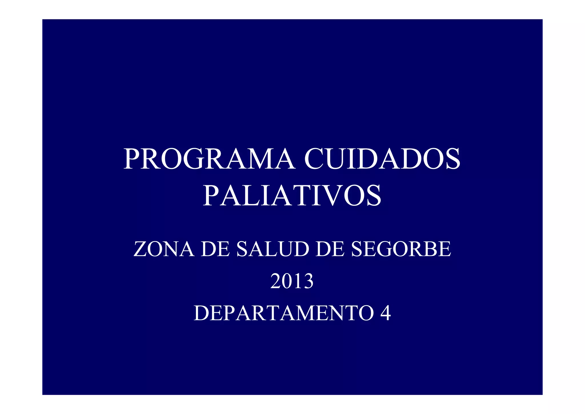 Este documento describe el programa de cuidados paliativos de la zona de salud de Segorbe para 2013. El programa tiene como objetivos mejorar la calidad de vida de los pacientes al final de la vida, proporcionar cuidados integrales y garantizar la prestación de estos cuidados por todos los profesionales de la zona. El programa define tres niveles de complejidad de pacientes y establece los protocolos de atención para cada nivel en atención primaria, hospitales y unidades de hospitalización a domicilio.