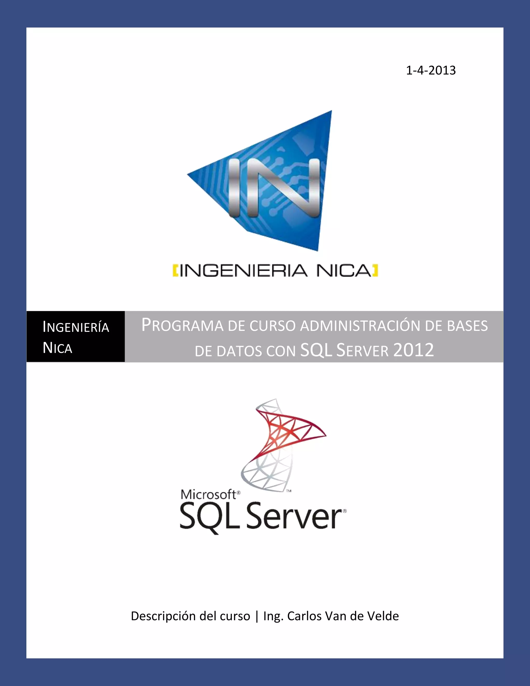 El documento presenta un curso de Administración de Bases de Datos con SQL Server 2012 Avanzado ofrecido por Ingeniería Nica. El curso dura hasta 2 meses y cubre temas como copias de seguridad, administración de Transact SQL, seguridad, auditoría y minería de datos. Los estudiantes deben haber tomado un curso básico de SQL Server previamente y pagar $60 para matricularse.