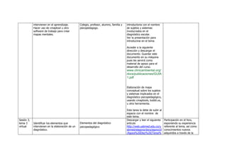 Este documento presenta el programa de un curso de educación especial semi-presencial. El objetivo general es ampliar los conocimientos de las estudiantes sobre la educación especial desde una perspectiva ecológica utilizando herramientas tecnológicas. El curso consta de 8 sesiones que cubren temas como el diagnóstico escolar, los sujetos involucrados, las discapacidades, percepciones sociales y la inclusión escolar. Las estudiantes completarán actividades como elaborar mapas conceptuales, videos, encuestas y una pá