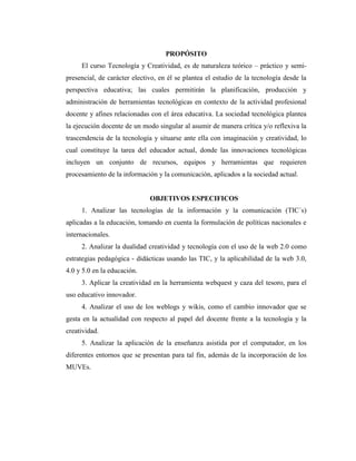 Este documento presenta la descripción del curso "Tecnología y Creatividad" de la Maestría en Educación Técnica de la Universidad Pedagógica Experimental Libertador. El curso analiza las tecnologías de la información y comunicación aplicadas a la educación, así como el uso de la creatividad y herramientas tecnológicas como estrategias pedagógicas. El curso se impartirá de forma semi-presencial a través de un entorno virtual de aprendizaje, e incluirá actividades como foros,