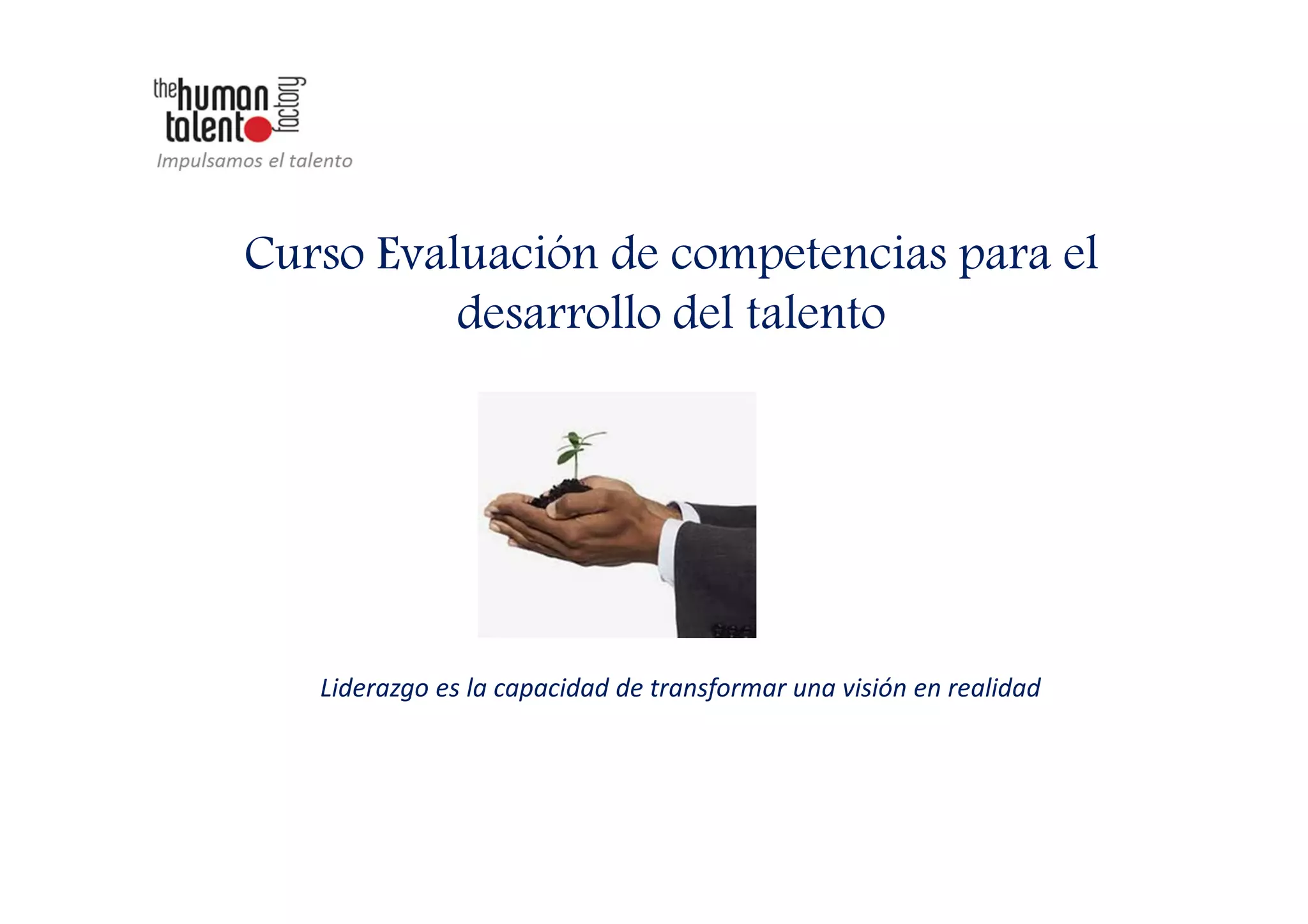 Este documento describe un curso sobre la evaluación de competencias para el desarrollo del talento. El curso ayuda a los líderes a identificar las competencias reales y el potencial de crecimiento de sus empleados mediante entrevistas y técnicas de evaluación, a fin de desarrollar equipos más eficientes. El curso cubre temas como la identificación de perfiles de competencias, la estructura de entrevistas de evaluación, y el uso de la retroalimentación para aplicar técnicas de coaching. Se utilizan ejercicios prá