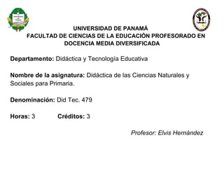 Este documento presenta un plan de estudios para la asignatura "Didáctica de las Ciencias Naturales y Sociales para Primaria" en la Universidad de Panamá. El plan consta de 4 módulos de 4 semanas cada uno, que cubren temas como la importancia de los seres vivos, las interrelaciones entre la materia y la energía, la salud y nutrición, y la convivencia con el medio ambiente y la sociedad. Cada módulo incluye objetivos, contenidos, estrategias didácticas y formas de evaluación.