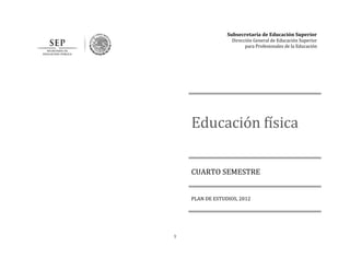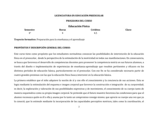 Este documento presenta el plan de estudios de un curso de Educación Física para la Licenciatura en Educación Preescolar. El curso busca que los estudiantes conozcan las posibilidades de la educación física en el preescolar para promover el desarrollo motriz de los niños a través de experiencias de enseñanza-aprendizaje. El curso se divide en tres unidades que cubren conceptos básicos, contenidos y estrategias didácticas como el juego motor. Al finalizar, los estudiantes deben presentar una un