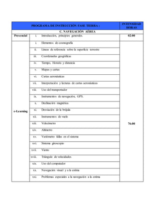 Este documento presenta el mapa curricular y distribución de temas para el curso de navegación aérea para pilotos de aeronaves pilotadas a distancia sin licencia previa. El curso se enfoca en transmitir los conocimientos y procedimientos de navegación para conducir eficientemente una aeronave y llegar al destino de forma segura. Los temas incluyen elementos de cosmografía, mapas, cartas aeronáuticas, instrumentos de navegación, sistemas de posicionamiento global, cálculos de velocidad, viento y