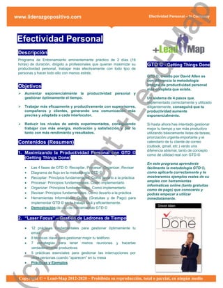 El programa de efectividad personal de 16 horas está diseñado para maximizar la productividad mediante la metodología GTD (Getting Things Done) y técnicas de gestión del tiempo, comunicación y reducción de estrés. Se incluyen prácticas para mejorar la comunicación y gestionar las interrupciones, así como herramientas informáticas para implementar estas metodologías en el trabajo. Además, el curso ofrece técnicas psico-físicas para reducir el estrés y mejorar el rendimiento personal, buscando un mejor equilibrio entre vida personal y laboral.