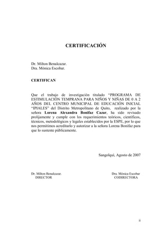 Este documento presenta los resultados de una investigación sobre un programa de estimulación temprana para niños de 0 a 2 años en un centro de educación inicial en Quito, Ecuador. El estudio analiza el desarrollo actual de los niños utilizando listas de verificación y entrevistas, y desarrolla una guía didáctica con actividades apropiadas para las diferentes etapas de desarrollo infantil temprano. El objetivo es mejorar la estimulación de los niños y aplicar los conocimientos de teóricos como Piaget y Montessori.
