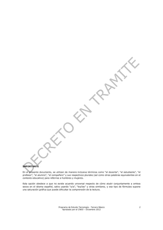 Este documento presenta el programa de estudio de Tecnología para tercero básico. Incluye nociones básicas sobre objetivos de aprendizaje, habilidades, conocimientos y actitudes. También contiene orientaciones para la implementación del programa, una visión global anual dividida en semestres y unidades, y anexos con glosarios, materiales y evaluación. El programa busca desarrollar habilidades tecnológicas en los estudiantes a través de objetivos, actividades y evaluaciones enfocadas en la resolución de problemas.