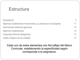 Este documento presenta la estructura y contenido del programa de estudio de Filosofía y Psicología. Describe los elementos del marco curricular como contenido conceptual, actividades de aprendizaje, sugerencias de evaluación y recursos de apoyo. Explica los objetivos y temas que se abordarán en los cursos de 3o y 4o medio de Filosofía, con un enfoque en el desarrollo personal y la formación ética. Además, propone orientaciones didácticas generales y objetivos fundamentales verticales para guiar la enseñ