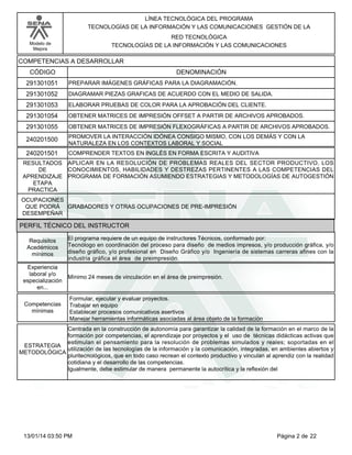Este documento describe un programa de formación técnica en preprensa digital para medios impresos. El objetivo del programa es capacitar a personas en el procesamiento de imágenes, diseño y armado de piezas gráficas, filmación de imágenes y obtención de productos de salida para impresión. El programa dura 6 meses de formación lectiva y 6 meses de práctica, para un total de 12 meses. El documento explica los contenidos, competencias, perfiles requeridos y estrategias metodológicas del programa.