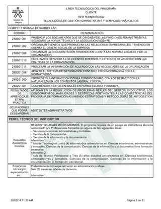 Este documento describe un programa técnico en asistencia administrativa ofrecido por el SENA en Colombia. El programa dura 12 meses y desarrolla competencias relacionadas con la atención al cliente, procesamiento de información, contabilidad, organización de eventos y apoyo administrativo. El resumen describe los objetivos del programa de brindar personal calificado para el desarrollo económico y las tecnologías requeridas, así como las competencias, requisitos, estrategias de enseñanza y contenidos del currículo.