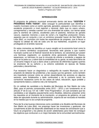 El documento presenta el programa de gobierno municipal para la alcaldía de San Martín de Loba (Bolívar) del candidato Juan de Jesús Rubiano Camargo para el periodo 2012-2015. Incluye información sobre el perfil del candidato, la formulación del programa centrado en el desarrollo productivo sostenible del municipio, y aspectos generales sobre la ubicación, clima, población e historia de San Martín de Loba.