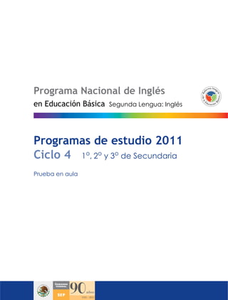 Este documento presenta el Programa Nacional de Inglés en Educación Básica de México, el cual tiene como objetivo incorporar la enseñanza del inglés de manera articulada en los niveles de preescolar, primaria y secundaria. Se describen las etapas de prueba y expansión del programa para su implementación gradual. Finalmente, se explica que el programa busca desarrollar competencias plurilingües e interculturales en los estudiantes para que puedan participar en un mundo globalizado.