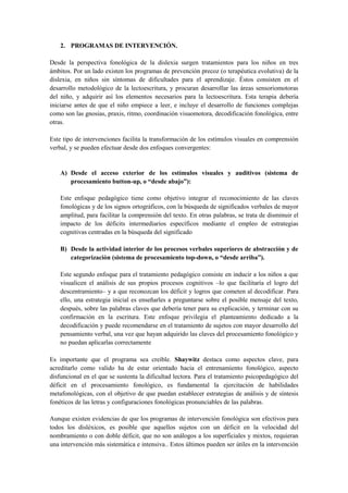 Este documento describe varios programas para el tratamiento de la dislexia. Incluye programas de intervención temprana para prevenir la dislexia, programas de entrenamiento fonológico y programas para desarrollar la conciencia fonológica en niños preescolares. También describe programas específicos como el programa clásico de entrenamiento motor y perceptual, el programa verbal-auditivo-musical y el tratamiento de Bakker basado en la estimulación hemisférica. El objetivo general de estos programas es ayudar a niños con dislex