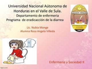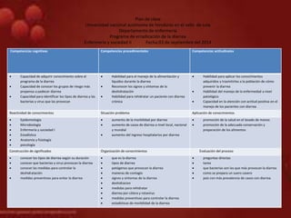 Este documento describe un programa de erradicación de la diarrea en la Universidad Nacional Autónoma de Honduras. Detalla las competencias cognitivas, procedimentales y actitudinales requeridas para el programa, así como los agentes infecciosos, síntomas, tratamientos y planes de manejo para la diarrea y deshidratación. El objetivo final es prevenir la morbilidad y mortalidad asociadas con la diarrea a través de la educación y rehidratación oral.