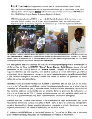 El documento habla sobre la Institución Intergubernamental para la Utilización de la Microalga Espirulina contra la Desnutrición (IIMSAM). Describe el programa de alimentación con Espirulina en el centro-este de África liderado por IIMSAM, incluyendo el apoyo de los Obama. También destaca los beneficios nutricionales de la Espirulina y su potencial para combatir la desnutrición y la inseguridad alimentaria según la ONU.