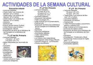 Este documento describe las actividades planeadas durante una semana cultural sobre la ciudad de Avilés en la Escuela Primaria El Quirinal. Los estudiantes de diferentes grados participarán en lecturas guiadas, talleres, visitas culturales, conciertos, exposiciones, concursos y más, todo enfocado en aprender sobre la historia, cultura y lugares emblemáticos de Avilés. El evento contará con la colaboración de varias instituciones culturales de la ciudad y espera ser una experiencia educativa y entretenida para los alumnos.