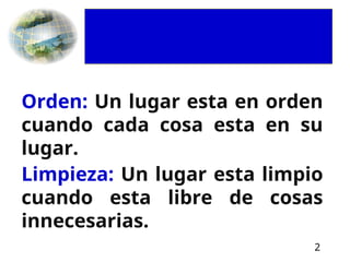 1. Orden implica acomodar los elementos necesarios de modo que sean fáciles de usar y etiquetarlos de tal suerte que cualquiera pueda encontrarlos y tomarlos para su uso.