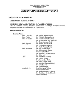 Este documento presenta la información académica relacionada con la asignatura de Medicina Interna I dictada en la Facultad de Medicina de la Fundación Héctor A. Barceló. Describe el equipo docente, la carga horaria, las correlatividades, los objetivos de enseñanza y la estructuración de los contenidos en nueve campos disciplinarios relacionados principalmente con sistemas y aparatos del cuerpo humano.
