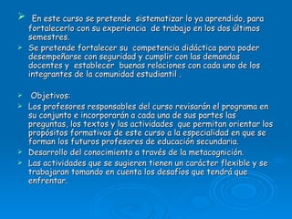 Este documento presenta el programa de observación y práctica docente de cuarto año para la licenciatura en educación secundaria. El programa busca fortalecer las competencias didácticas de los estudiantes a través de la observación de clases y la reflexión sobre su experiencia docente previa, para que puedan desempeñarse con seguridad como profesores. El programa se organiza en cuatro bloques y propone actividades como la preparación para las observaciones, el desarrollo de estrategias de enseñanza, trabajo en equipo y autoevalu