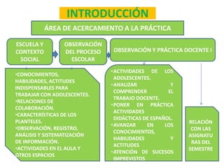 El documento presenta un programa de observación y práctica docente para estudiantes de la licenciatura en educación secundaria, enfocándose en el aprendizaje y desarrollo de habilidades para trabajar con adolescentes. Incluye objetivos generales, actividades prácticas y evaluaciones para fortalecer la relación entre la enseñanza y los aprendizajes de los estudiantes en el área de español. Se enfatiza la importancia de la observación, la elaboración de planes de trabajo y el análisis crítico de las experiencias educativas.