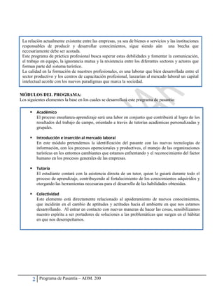 Este documento presenta el programa de pasantía para estudiantes de Administración de Empresas Turísticas y Hoteleras de la Universidad Autónoma de Santo Domingo. El programa busca insertar a los estudiantes en la industria turística mediante 300 horas de prácticas en empresas. Los objetivos son capacitar a los estudiantes y vincular lo aprendido en el aula con la realidad de las organizaciones turísticas. El programa consta de módulos académicos y de introducción al mercado laboral, con tutoría y evaluación continua