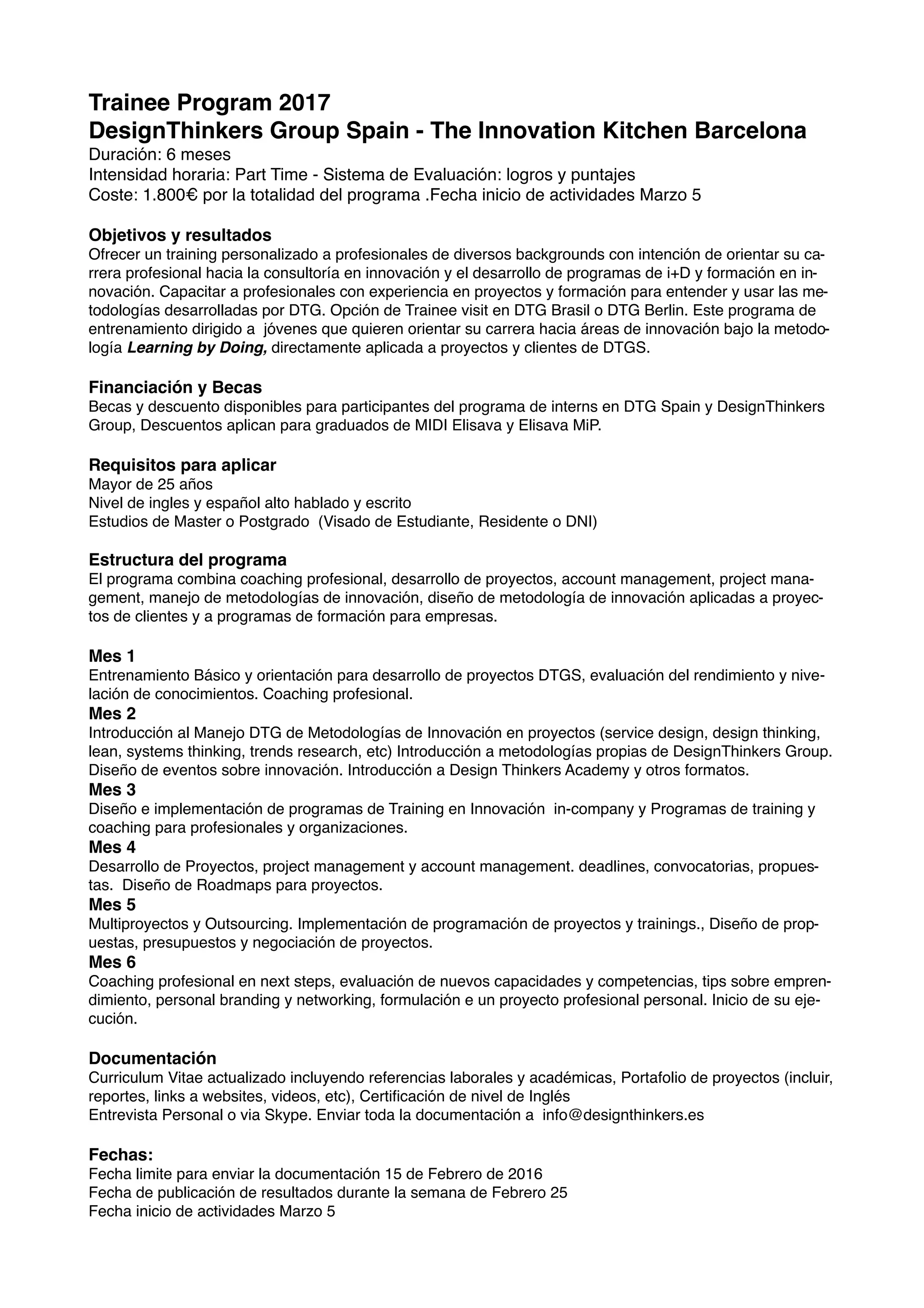 El programa de formación Trainee 2017 de DesignThinkers Group España ofrece un entrenamiento de seis meses en innovación y consultoría, dirigido a profesionales de diversos backgrounds. Los participantes recibirán coaching, capacitación en metodologías de innovación y la oportunidad de desarrollar proyectos reales, con requisitos que incluyen inglés y español fluido, y estudios de máster o postgrado. El programa no cubre gastos de alojamiento ni manutención, y finaliza con un certificado y una evaluación de competencias.