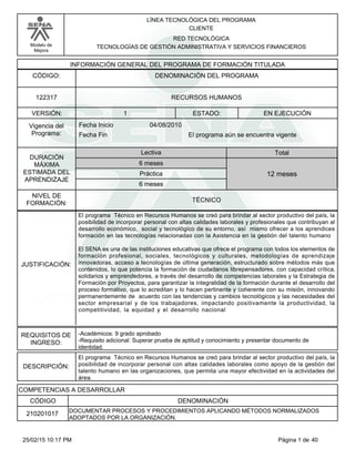Este documento proporciona información general sobre un programa de formación técnica en Recursos Humanos ofrecido por el SENA en Colombia. El programa dura 12 meses y busca brindar capacitación en gestión del talento humano para apoyar el desarrollo económico y social del país. El programa desarrolla competencias relacionadas con la documentación de procesos, la gestión de información y el apoyo a clientes internos y externos.