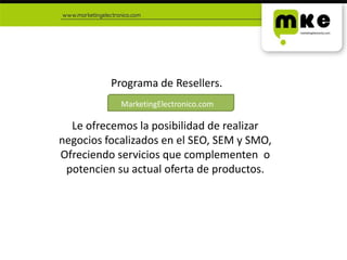 Este documento presenta una propuesta para que los resellers se asocien con MarketingElectronico.com para ofrecer servicios de SEO, SEM y SMO. Los resellers pueden ganar comisiones referiendo clientes o vendiendo los servicios de la compañía bajo su propia marca. Las comisiones varían entre el 5-15% dependiendo del modelo y monto de las ventas generadas.