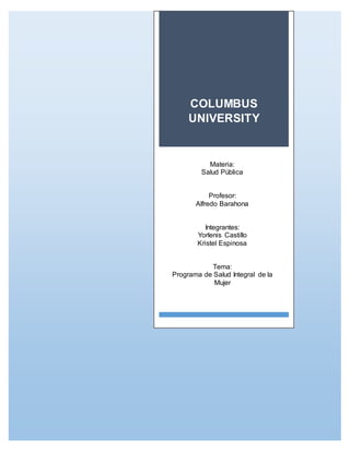 El documento presenta las normas y lineamientos del Programa de Salud Integral de la Mujer en Colombia. El programa busca ofrecer atención integral a la salud de la mujer durante todas las etapas de su vida, con énfasis en la detección temprana de cáncer de cuello uterino y mamas, la atención prenatal, y la educación en salud reproductiva y climatérica. El documento describe los objetivos, componentes y niveles de implementación del programa a nivel nacional, regional y local para mejorar la salud y calidad de vida de las