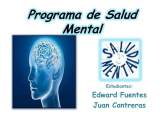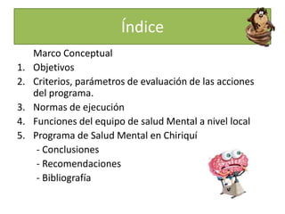 Este documento presenta un programa de salud mental que tiene como objetivos elevar el nivel de salud mental de la población, contribuir a la formación de personal especializado, y promover la investigación en salud mental. Describe los criterios y parámetros de evaluación del programa, las normas de ejecución a nivel nacional, regional y local, y las funciones del equipo de salud mental a nivel local. También resume brevemente el programa de salud mental en la provincia de Chiriquí.