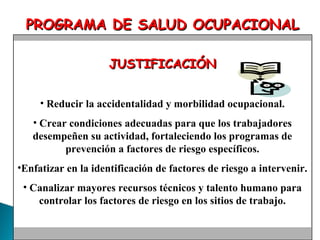 El documento describe un programa de salud ocupacional de empresa. El programa busca reducir la accidentalidad y morbilidad laboral creando condiciones de trabajo seguras. Se justifica la inversión en prevención para reducir costos como el ausentismo y compensar trabajadores accidentados. El programa incluye subprogramas de medicina preventiva, medicina del trabajo, higiene y seguridad industrial, y funcionamiento de comités de salud ocupacional.