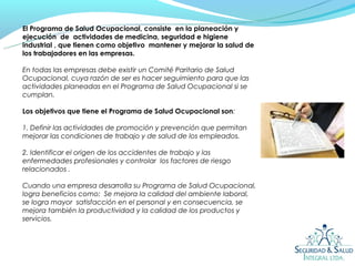 El programa de salud ocupacional tiene como objetivo mantener y mejorar la salud de los trabajadores a través de actividades de medicina, seguridad e higiene industrial. Cada empresa debe tener un comité de salud ocupacional que supervise la implementación del programa. Al desarrollar el programa, las empresas se benefician con una mejor calidad del ambiente laboral y mayor productividad.