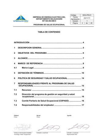 Este documento presenta el Programa de Salud Ocupacional de la Empresa de Energía Eléctrica del Departamento del Guaviare. Describe la empresa, los objetivos del programa, su alcance y marco legal. Incluye las responsabilidades de la dirección, los trabajadores y el Comité Paritario de Salud Ocupacional. También presenta los diagnósticos de las condiciones de salud y trabajo de los empleados, así como la planeación, organización y ejecución del programa.