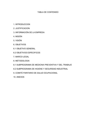 Este documento presenta un programa de salud ocupacional para la empresa MEDA ASESORES S.A.S. El programa incluye una introducción, justificación, información de la empresa, objetivos, marco legal y metodología. La metodología consiste en subprogramas de medicina preventiva, medicina del trabajo e higiene y seguridad industrial, así como en el funcionamiento del comité paritario de salud ocupacional de la empresa. El objetivo general del programa es diseñar e implementar medidas para preservar, mantener y mejorar la salud de los trabajadores