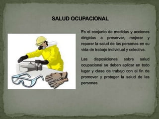 El documento describe el Programa de Salud Ocupacional del Servicio Nacional de Aprendizaje (SENA). El SENA se compromete a mantener el bienestar físico y social de sus trabajadores mediante la prevención de lesiones y enfermedades laborales. El programa tiene como misión garantizar ambientes de trabajo seguros que contribuyan a mejorar la calidad de vida de los trabajadores.