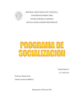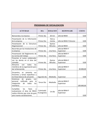 El resumen presenta un programa de socialización para nuevos empleados de una empresa que consta de varias actividades a realizarse durante los primeros días de trabajo. La primera actividad es una bienvenida de 30 minutos el primer día. Luego, presentaciones sobre la empresa, su estructura y normas durante el primer día. El primer día también incluye un recorrido por las instalaciones y un almuerzo de bienvenida. El segundo día se presentan las funciones específicas del empleado. El tercer día hay dinámicas grupales de integración facilitadas por personal calificado
