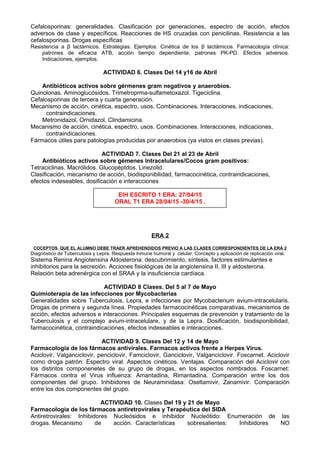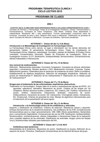 Este documento presenta un programa terapéutico clínico dividido en tres eras. Cada era contiene conceptos previos que los alumnos deben conocer y varias actividades con temas de farmacología clínica. Los temas incluyen metodología de investigación, uso racional de medicamentos, tratamiento de enfermedades respiratorias y cardiovasculares, antibióticos, antivirales, antifúngicos y antiparasitarios, coagulación sanguínea, hipertensión arterial e insuficiencia cardíaca. Cada actividad describe