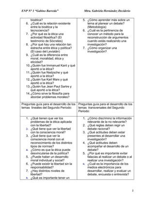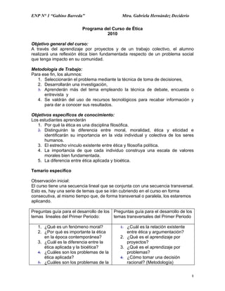 Este documento presenta el programa de un curso de ética para el año 2010. El objetivo general es que los estudiantes realicen una reflexión ética bien fundamentada sobre un problema social de su comunidad a través de un proyecto de aprendizaje colaborativo. Los estudiantes aprenderán conceptos éticos fundamentales y aplicarán metodologías como debates, encuestas e investigación para analizar un problema y proponer soluciones. El curso se evaluará a través de exámenes periódicos y un proyecto final de investigación y difusión.