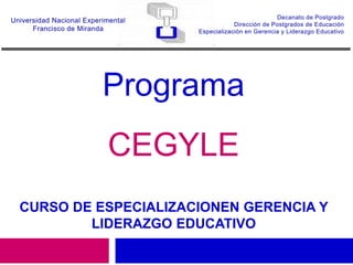 Este documento presenta la información sobre el Programa de Especialización en Gerencia y Liderazgo Educativo. El programa busca formar profesionales en teorías y prácticas de gerencia y liderazgo educativo moderno y capacitarlos en procesos administrativos vinculados a la gerencia educativa. El plan de estudio incluye unidades curriculares en gerencia, liderazgo, planificación educativa, desarrollo organizacional y más, con el objetivo de desarrollar competencias técnicas y prácticas en los estudiantes
