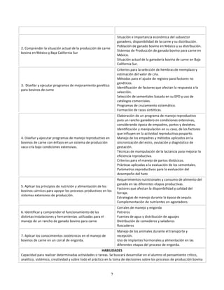 Este documento presenta un programa educativo para la asignatura de Zootecnia de bovinos cárnicos. El propósito general es que los estudiantes puedan planear, dirigir y evaluar la producción de carne bovina de manera eficiente y rentable. El programa describe las subunidades de competencia que incluyen identificar diferentes tipos de ganado para carne y entender la situación actual de la producción de carne bovina en México y Baja California Sur. También presenta los conocimientos necesarios para adquirir estas competencias.