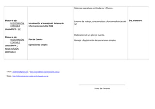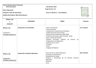 Este documento presenta el plan de estudios de un curso de informática de tercer año de nivel secundario. El curso se divide en cuatro bloques temáticos: entorno operativo, sistemas operativos, sistema de información contable e introducción a la contabilidad. Las unidades cubren temas como hardware, software, sistemas operativos como Windows y Linux, y conceptos básicos de contabilidad como plan de cuentas y registro de operaciones. El curso se dicta los días de la mañana y tiene una carga horaria semanal de una hora.