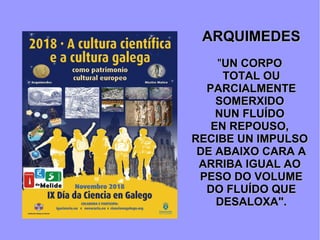 El primer documento describe el principio de Arquímedes, que establece que un cuerpo total o parcialmente sumergido en un fluido en reposo recibe un empuje hacia arriba igual al peso del volumen de fluido desplazado. El segundo documento habla sobre un experimento con un fluido no newtoniano, la harina de maíz, y el tercer documento explica cómo funcionan los submarinos basándose en el principio de Arquímedes.