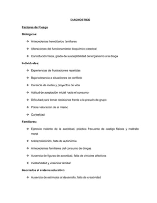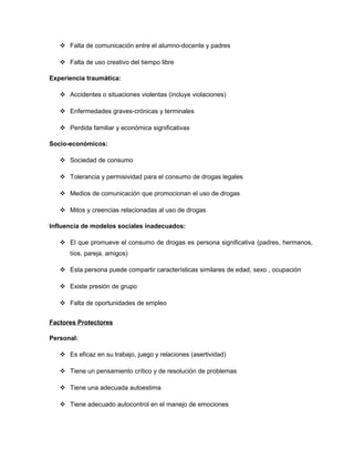 El documento describe los factores de riesgo y protectores relacionados al consumo de drogas, así como los objetivos de prevención. Los factores de riesgo incluyen antecedentes familiares, baja autoestima, falta de comunicación familiar y escasa información sobre drogas. Los factores protectores son el apoyo familiar, oportunidades educativas y recreativas, y desarrollo de habilidades para la toma de decisiones. Los objetivos son concientizar sobre los riesgos de las drogas y promover estilos de vida saludables a través de mejorar la