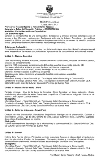 El documento presenta el programa anual de la asignatura Taller de Educación Práctica - Computación en la Escuela de Comercio N° 31 de la Ciudad de Buenos Aires. El programa consta de 4 unidades que cubren los sistemas operativos, procesadores de texto, editores de imágenes, e Internet. El objetivo es que los alumnos conozcan los componentes de una computadora y utilicen diferentes aplicaciones informáticas con criterios de elección personal y espíritu crítico.