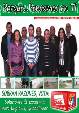 El documento presenta el programa electoral de Izquierda Unida para las elecciones municipales en Lupión y Guadalimar. Propone mejorar el acceso al empleo, la vivienda y la educación. También mejorar las infraestructuras como carreteras, alumbrado y caminos. Otras propuestas incluyen fomentar la participación ciudadana, el deporte, la cultura y políticas sociales y de medio ambiente. El objetivo es trabajar para mejorar la calidad de vida de los ciudadanos.