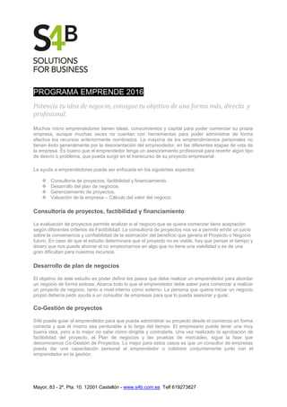 El programa Emprende 2016 de S4B ofrece asesoramiento a micro emprendedores para ayudarles a administrar sus recursos y maximizar el éxito de sus empresas. Los servicios incluyen consultoría de proyectos, desarrollo de planes de negocio, co-gestión de proyectos y valuación empresarial. Al proporcionar herramientas y guía profesional, se busca evitar la desorientación y aumentar las posibilidades de éxito en los emprendimientos.